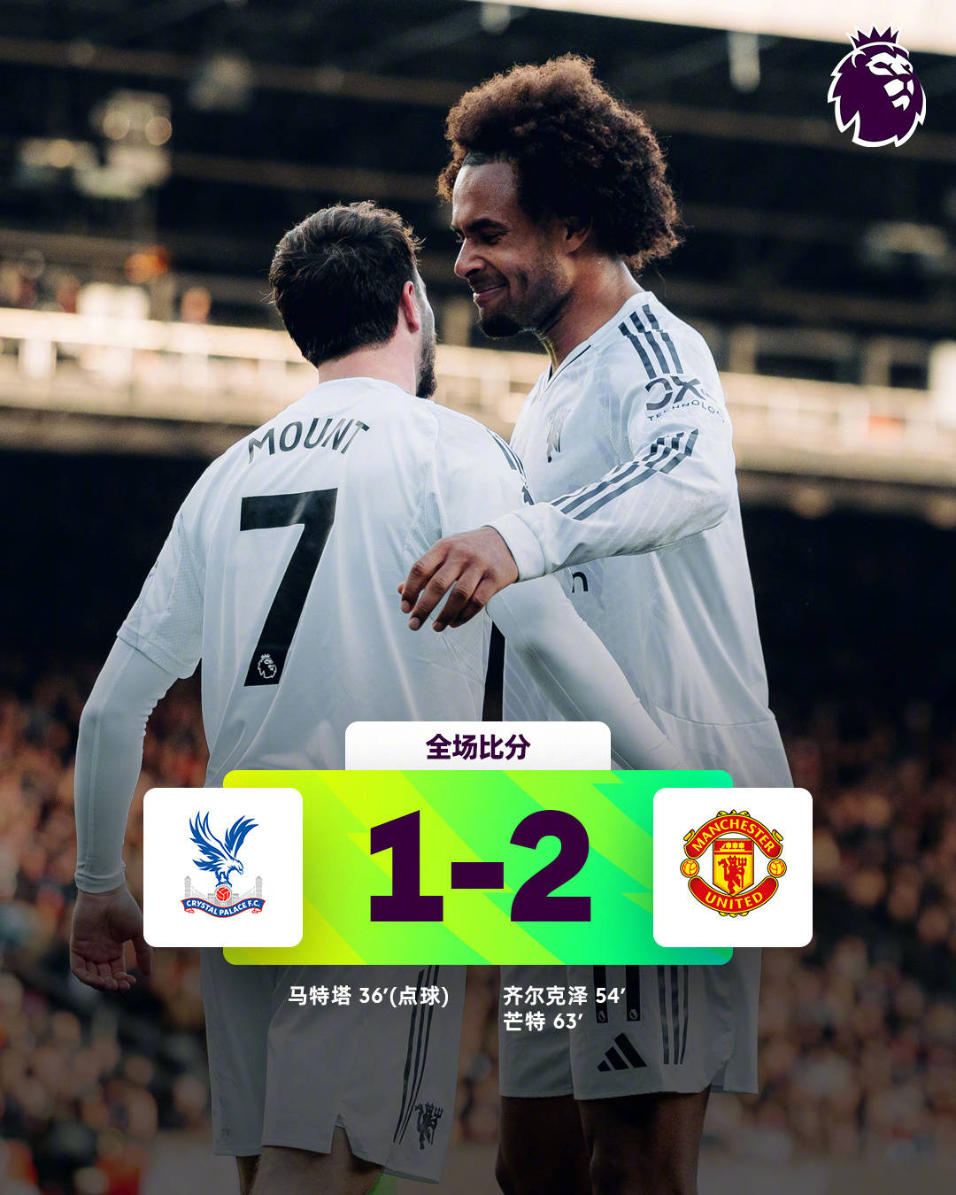 第63分钟,曼联再获禁区前沿任意球,B费假意射门突然一拨,芒特插上后一脚贴地斩,皮球绕过人墙直入远角,2-1!