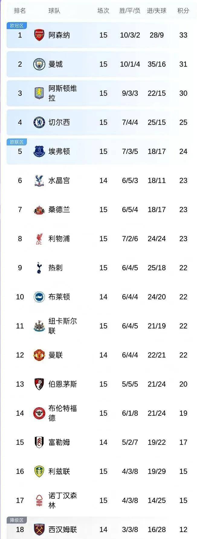 这一夜过后,英超积分榜的顶端彻底压缩。 阿森纳33分,曼城31分,阿斯顿维拉30分,前三名球队之间仅仅相差一场球的3分。
