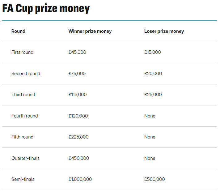 那么要达到超过联赛杯冠军奖金的足总杯晋级轮次又是几轮呢?本赛季仅需进入足总杯第四轮就能超越联赛杯的冠军奖金。而闯过足总杯首轮就可获得6.5万英镑,比联赛杯亚军利物浦的奖金高出1.5万英镑。
