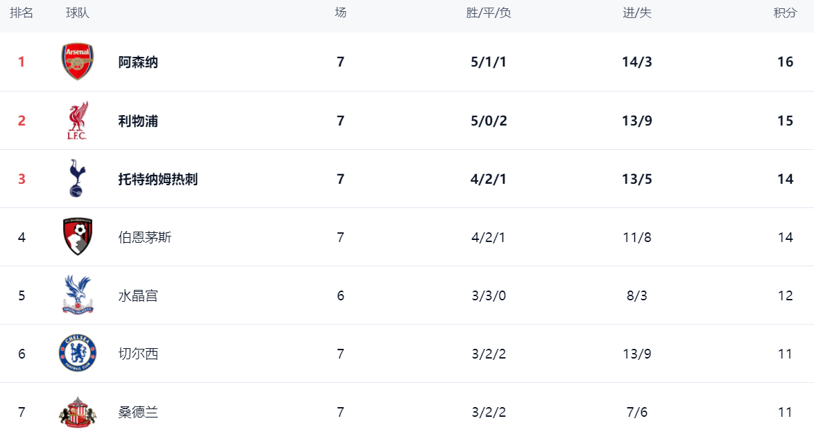 在积分榜上,赢球的阿森纳登上了榜首位置。阿森纳5胜1平1负,拿到了16分。利物浦这轮落败,依然是15分,排名第2。热刺以14分排名第3。伯恩茅斯这匹黑马也是14分,排名第4。水晶宫以12分排名第5。切尔西和桑德兰都是11分。曼城和曼联则都是10分。返回搜狐,查看更多