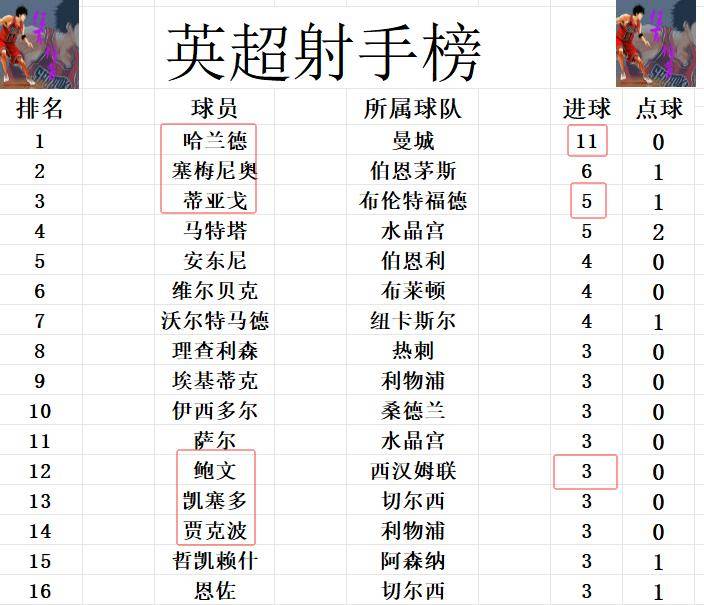 在射手榜上,哈兰德以11球继续领跑,稍微领先于姆巴佩。塞梅尼奥以6球排在第二,蒂亚戈虽多次错失机会,但凭借今天的进球,他与马特塔以5球并列第三。鲍文未能进球,依然与埃基蒂克、贾克波、恩佐、哲凯赖什等人以3球并列进入射手榜前十。