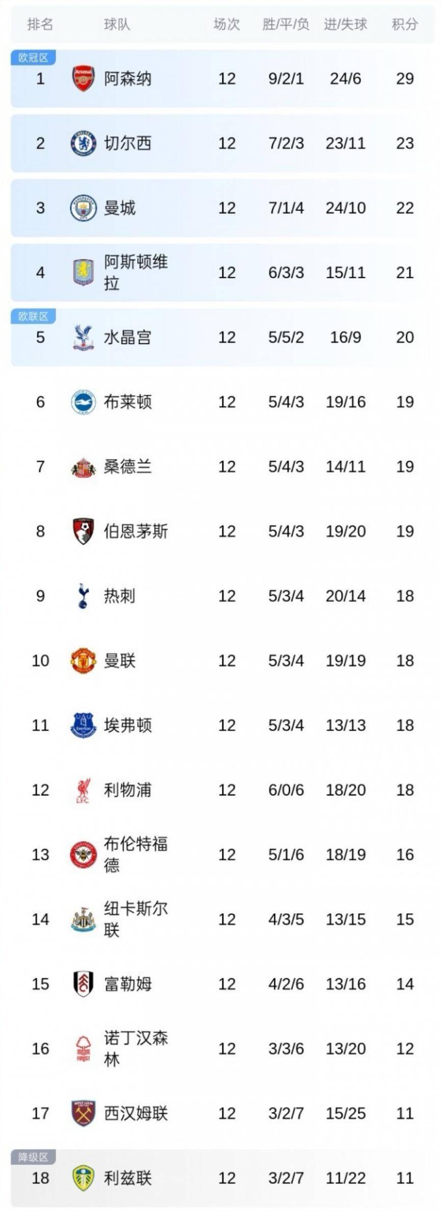 与此同时,阿森纳在本轮北伦敦德比中4-1大胜热刺,以29分稳居榜首,领先第二名切尔西6分。 从第2名切尔西到第12名利物浦,11支球队分差仅有5分,英超积分榜中游陷入空前混战。