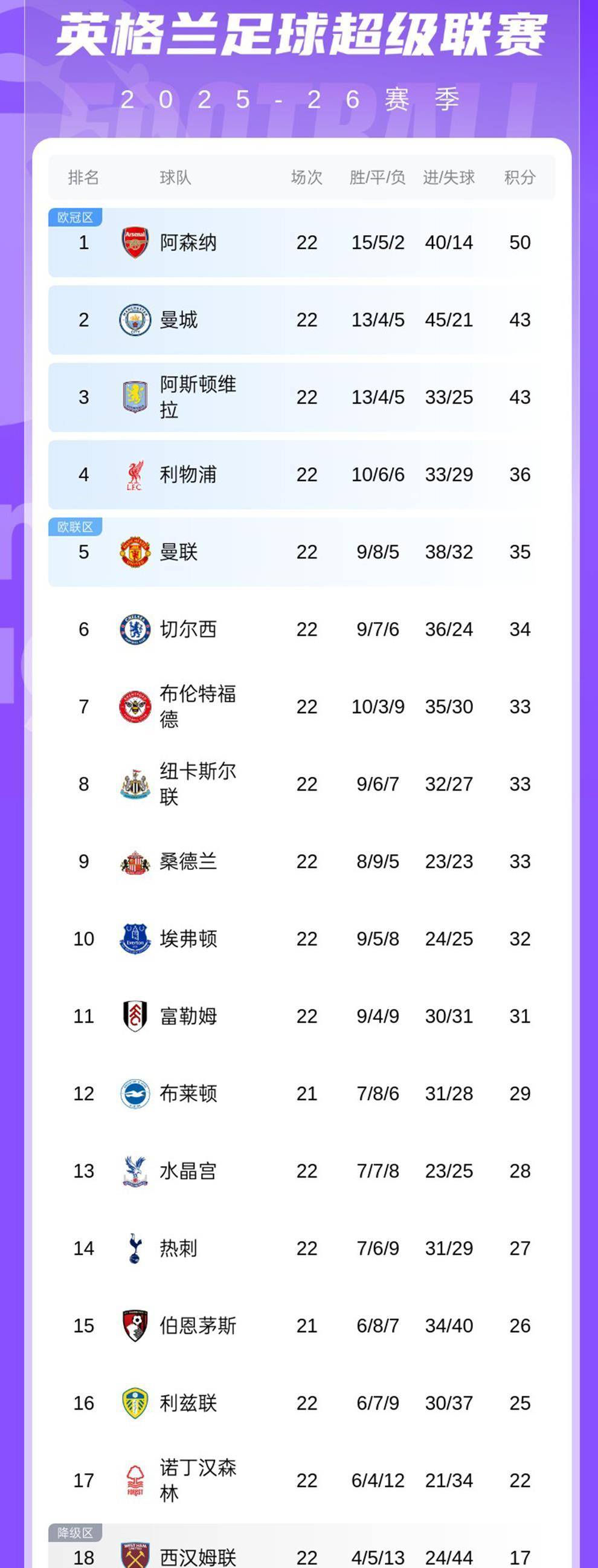 曼城和维拉同积43分,因净胜球差异分列二、三位。 这意味着一向稳定的曼城,其追赶者的角色并未改变,但身边多了一个同分的、野心勃勃的挑战者维拉。 维拉虽然输掉了关键战,但整个上半程的出色表现,已经让他们稳居争冠集团。 中游区域的竞争同样白热化,利物浦、曼联、切尔西彼此间只有一两分的差距,每一轮的胜负都可能让排名发生洗牌。