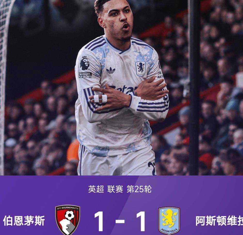 而另一边,阿斯顿维拉客场挑战伯恩茅斯。比赛一开始,维拉门将马丁内斯便进入状态,连续扑出了克鲁皮和埃瓦尼尔森极具威胁的射门,力保球门不失。顶住了主队开场阶段的猛攻后,维拉在第22分钟率先打破僵局,摩根-罗杰斯接队友妙传,右路一脚劲射,皮球直挂死角,帮助客队取得1-0的领先。然而,维拉的领先优势并没有保持到下半场。第55分钟,伯恩茅斯冬窗新援,年仅19岁的小将拉扬带球突破至禁区后,一脚冷静的低射洞穿了马丁内斯的十指关,将比分扳为1-1。此后,伯恩茅斯越战越勇,克鲁皮曾再度攻破维拉球门,但同样因越位在先被判无效。最终,1-1的比分被保持到终场。