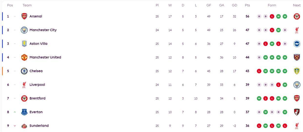 英超第25轮的这些比赛结果,把联赛格局撕成了三个鲜明的阵营:阿森纳一骑绝尘向着冠军冲刺;曼联、切尔西、维拉和曼城(少赛)混战争四;利物浦则站在悬崖边,接下来每一场都是决赛。 保级区里,狼队几乎锁定一个降级名额,另外两个席位将在四五支球队之间产生。