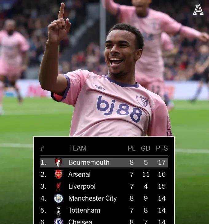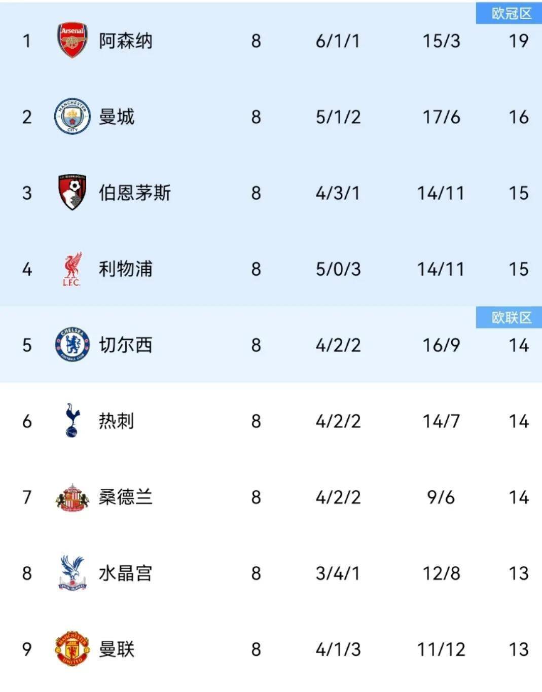 积分榜上,阿森纳19分领跑,曼城16分紧随其后。利物浦和伯恩茅斯同积15分,切尔西、热刺同积14分。曼联积分达到13分,排名第九位。