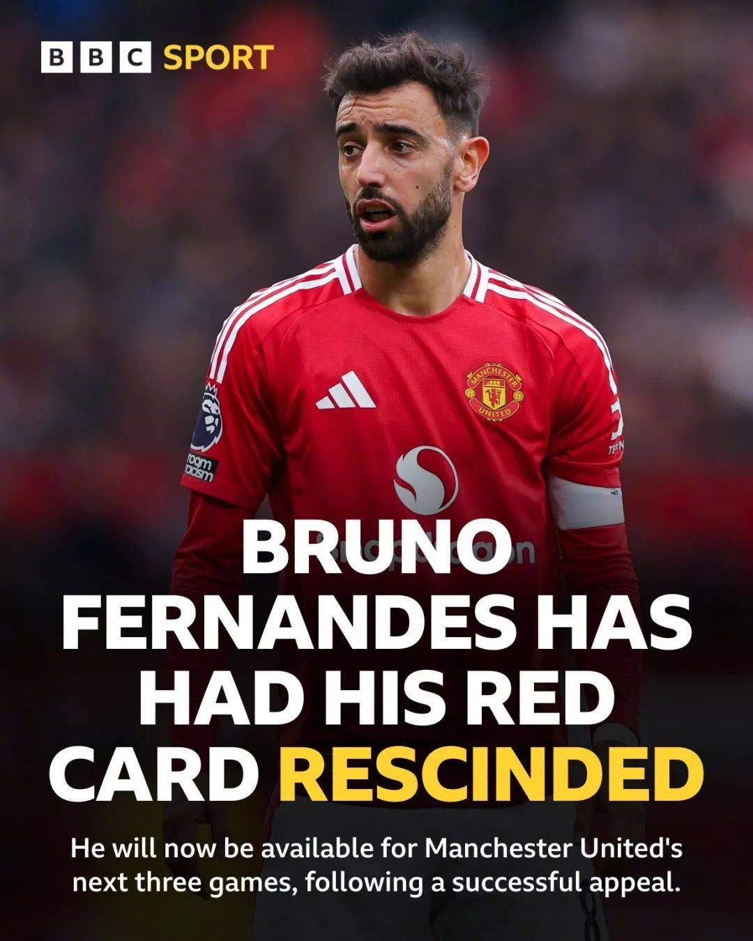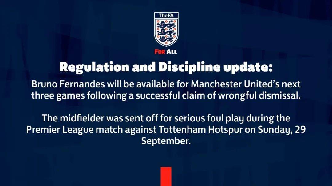 曼联官方在一份声明中表示,俱乐部对于B费在对阵热刺比赛中被出示的红牌表示不服,认为裁判的判罚存在争议。因此,俱乐部决定向英超联赛官方提出上诉,以寻求公正的裁决。经过英超联赛官方的审理,B费的红牌最终被撤销。这意味着B费将无需承受原判的三场停赛处罚,可以正常出战接下来对阵阿斯顿维拉、布伦特福德、西汉姆联的三场英超联赛。