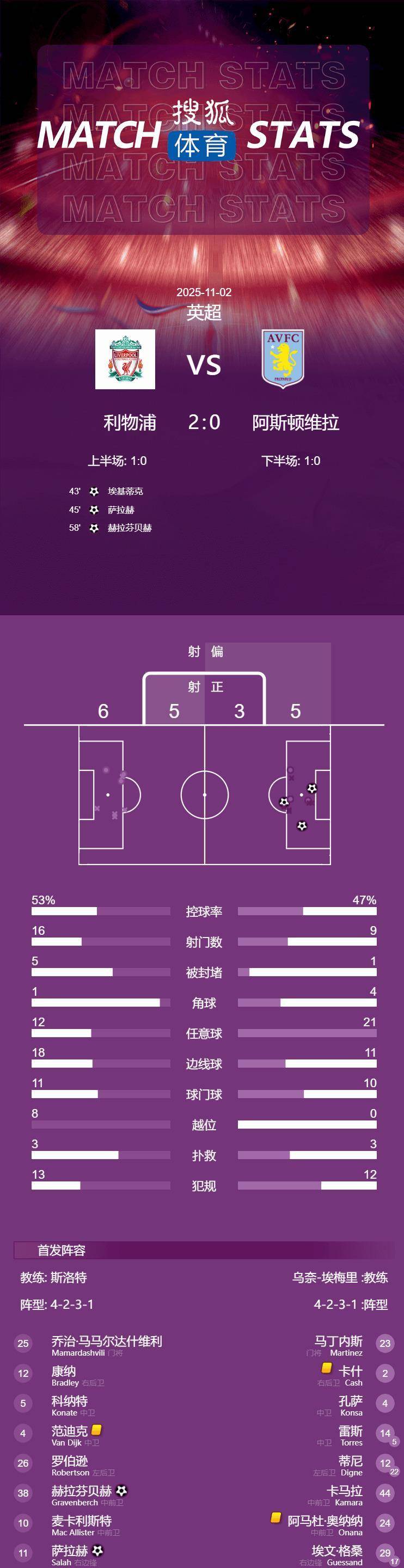 然而,主队利物浦也并非全无收获,尽管在上半场比赛的第43分钟,埃基蒂克曾一度头球破门,但遗憾的是,他稍稍领先于防守球员,越位在先的判罚让这粒进球被判无效。纵观整个上半场,利物浦在进攻端的表现远比对手更加活跃,他们创造了多达13次射门机会,远远超过维拉的5次。然而,直到伤停补时阶段才打破僵局,这无疑也折射出球队在连败期间所累积的深层焦虑感,进球的到来显得尤为不易。