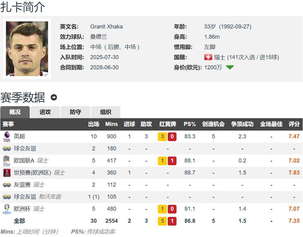 33岁的扎卡,身价为1200万欧元,今夏以1500万欧元从德甲勒沃库森转会至英超升班马桑德兰,迅速成为球队的核心人物和队长。扎卡在中场的表现稳健且全面,本赛季至今他出战了所有的10场英超比赛,且每一场都是首发。扎卡不仅贡献了1个进球,还送出了3次助攻。凭借他的出色表现,桑德兰目前在英超排名第四,扎卡成为了球队成功的关键所在。1500万欧元的转会费买到一位既有英超经验、又具备领导能力的中场球员,对于桑德兰来说无疑是一次超值引援。扎卡在场上不仅能高效调度,还能攻防兼备,堪称黑猫军团的“大脑”。