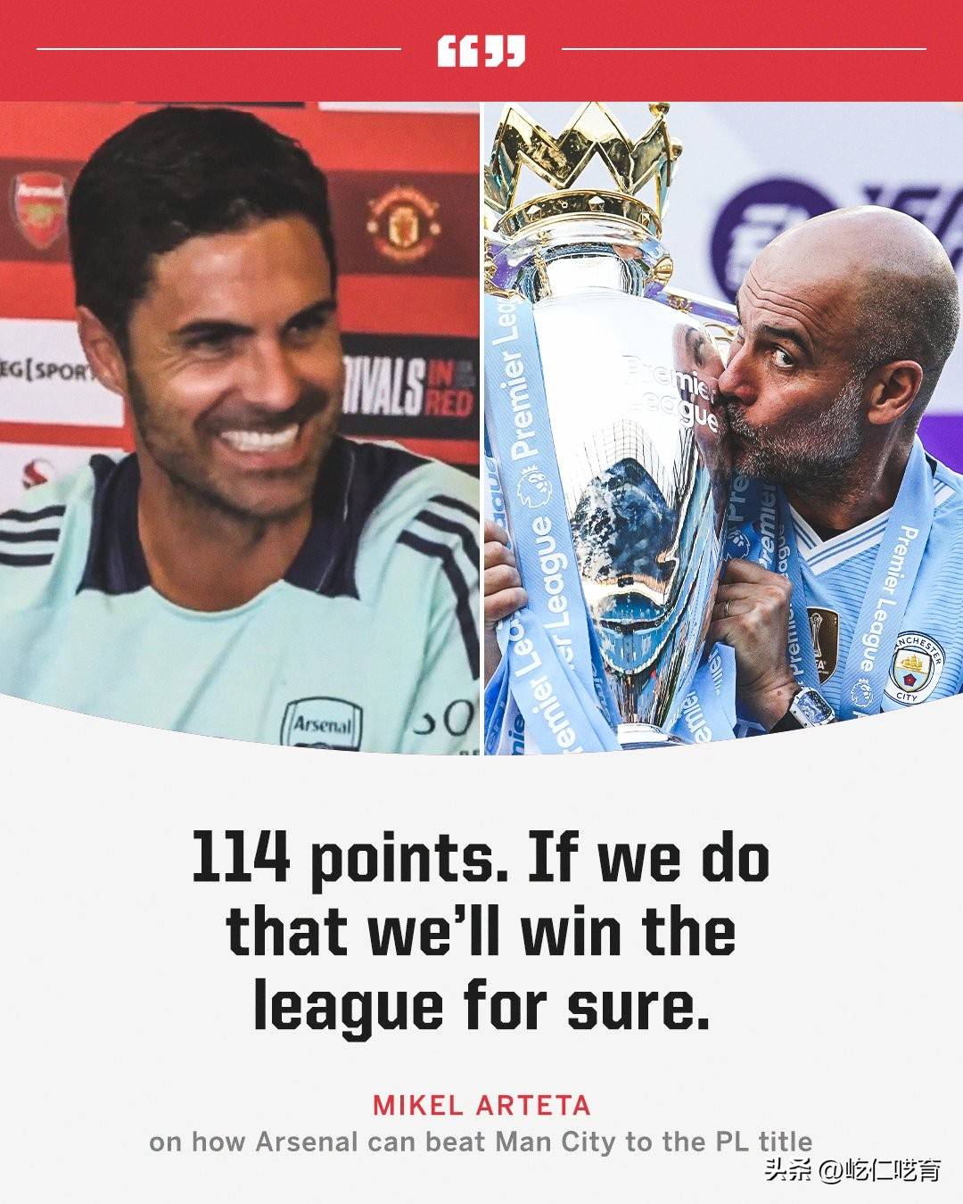 到了2024年夏天,当媒体问阿尔特塔如何才能战胜瓜迪奥拉夺得冠军时,阿尔特塔的回答很干脆:“38轮全胜,拿到114分就能赢!”这句话也反映出阿森纳对于自己争冠的决心与信心。