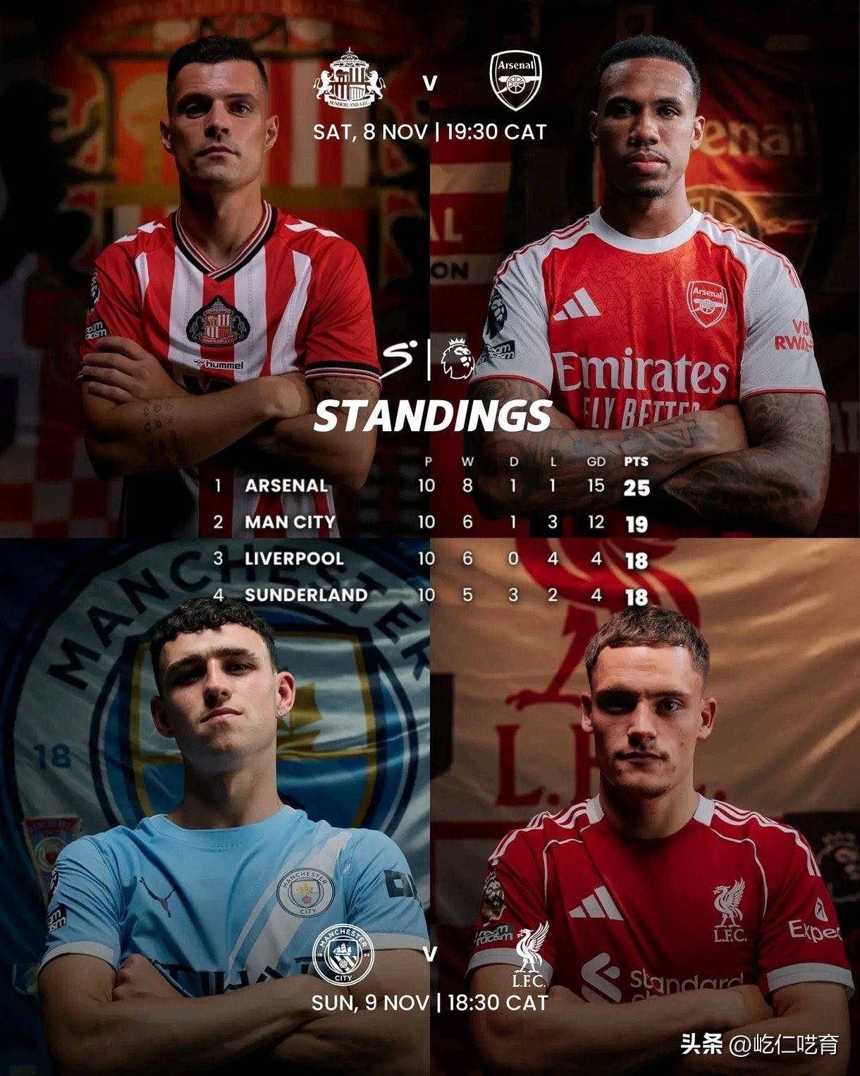 在英超第11轮开赛前,阿森纳以25分位居榜首,曼城积19分排在第二,而利物浦和桑德兰则以18分分列第三和第四。因此,第11轮的两场比赛——阿森纳客场挑战桑德兰,利物浦客场挑战曼城,被认为是争冠和争欧冠席位的提前“决赛”。然而,经过这轮比赛后,阿森纳、曼城和桑德兰的排名并没有发生变化,但利物浦的排名却已经掉队。
