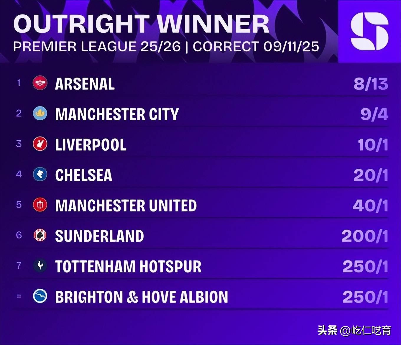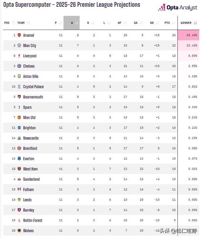 Opta的预测虽然并非百分百准确,但至少它提供了一个基于当前表现的合理预判。从阿森纳本赛季8胜2平1负的表现来看,只要他们能保持这种状态,最终夺冠几乎是时间问题。而Squawka的分析也相似,认为阿森纳遥遥领先,曼城紧随其后,其他球队几乎都只能是陪衬。根据Squawka的数据,阿森纳的赔率为8/13,曼城为9/4,利物浦则为10/1,而切尔西则为20/1。