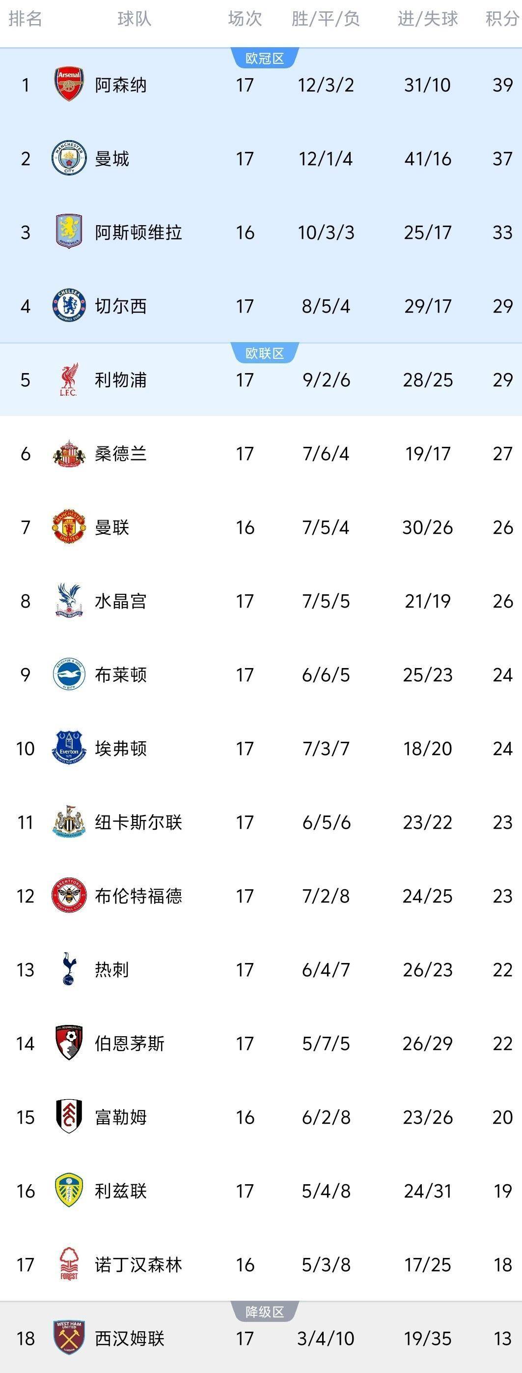 三场比赛的结果,让英超积分榜在圣诞节前发生了剧烈震荡。 阿森纳的39分让他们在榜首位置建立了初步的安全区。 而利物浦拿下关键的客场胜利后,积分紧咬第一集团,重新燃起了冲击前四甚至更高排名的希望。 最戏剧性的变化发生在欧战区边缘,原本位列第7的水晶宫,因为这场不可思议的1-4溃败,积分停滞不前,在实时积分榜上已经被身后的球队超越,直接跌出了欧战资格区(前六名)。