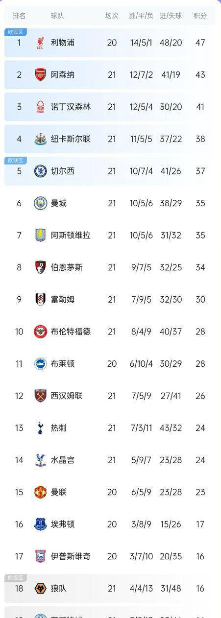 目前积分榜上,领头羊利物浦以47分暂居榜首,但仅领先阿森纳4分,争冠悬念再起。诺丁汉森林积41分排名第三,纽卡斯尔以38分升至第四,切尔西跌至第五,而曼城、维拉同积35分,位列第六、第七。伯恩茅斯积34分排名第八,争四形势混乱。