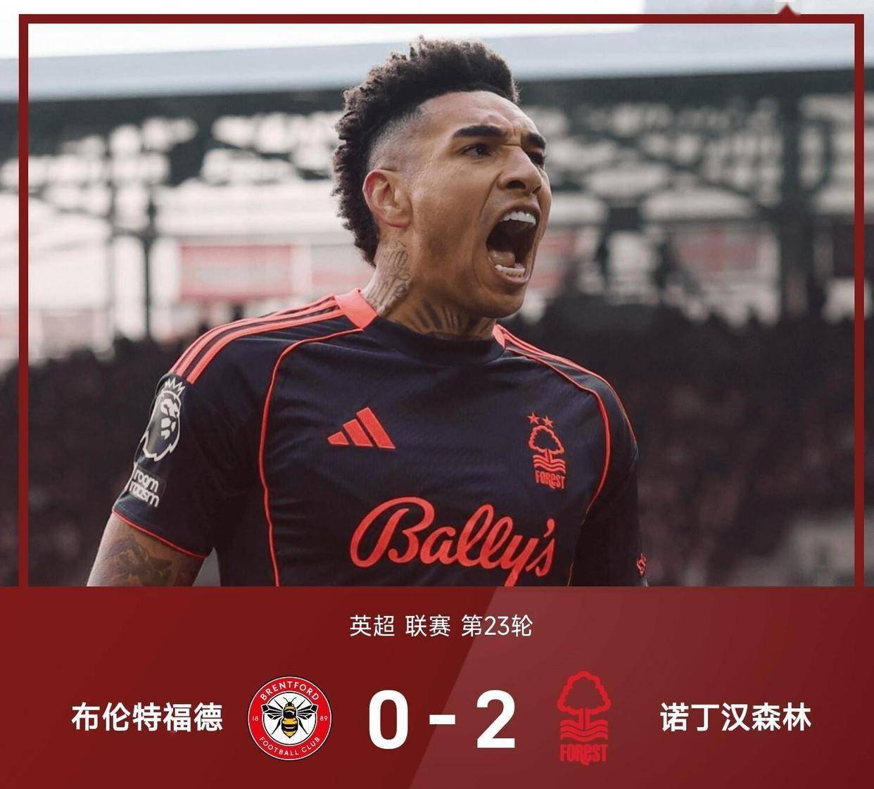 在伦敦的另一块场地上,保级球队诺丁汉森林客场挑战布伦特福德。 比赛第12分钟,诺丁汉森林便取得梦幻开局。 右后卫埃纳在右边路利用速度突破下底,随后送出一记低平传中球。