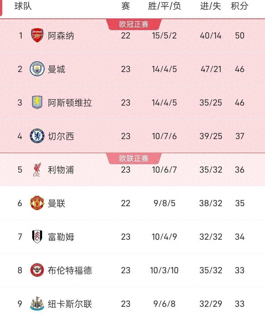 英超直播,英超赛程,英超积分榜,英超比分预测,曼联利物浦直播/覆盖2025年英超联赛所有比赛,提供免费高清中文直播入口、最新赛程安排、实时积分榜、比分预测与波胆分析,聚焦曼联、利物浦、曼城、阿森纳等豪门动态。2026年1月26日,英超联赛第23轮的三场比赛全部结束,一个惊人的巧合是,所有客队都带走了胜利。 切尔西在塞尔赫斯特公园球场3-1击败水晶宫,阿斯顿维拉在圣詹姆斯公园球场2-0战胜纽卡斯尔联,诺丁汉森林在布伦特福德社区球场2-0取胜。 这一结果让英超积分榜在夜间更新后出现了新的格局,尤其是争夺欧冠资格的区域,竞争骤然加剧。
