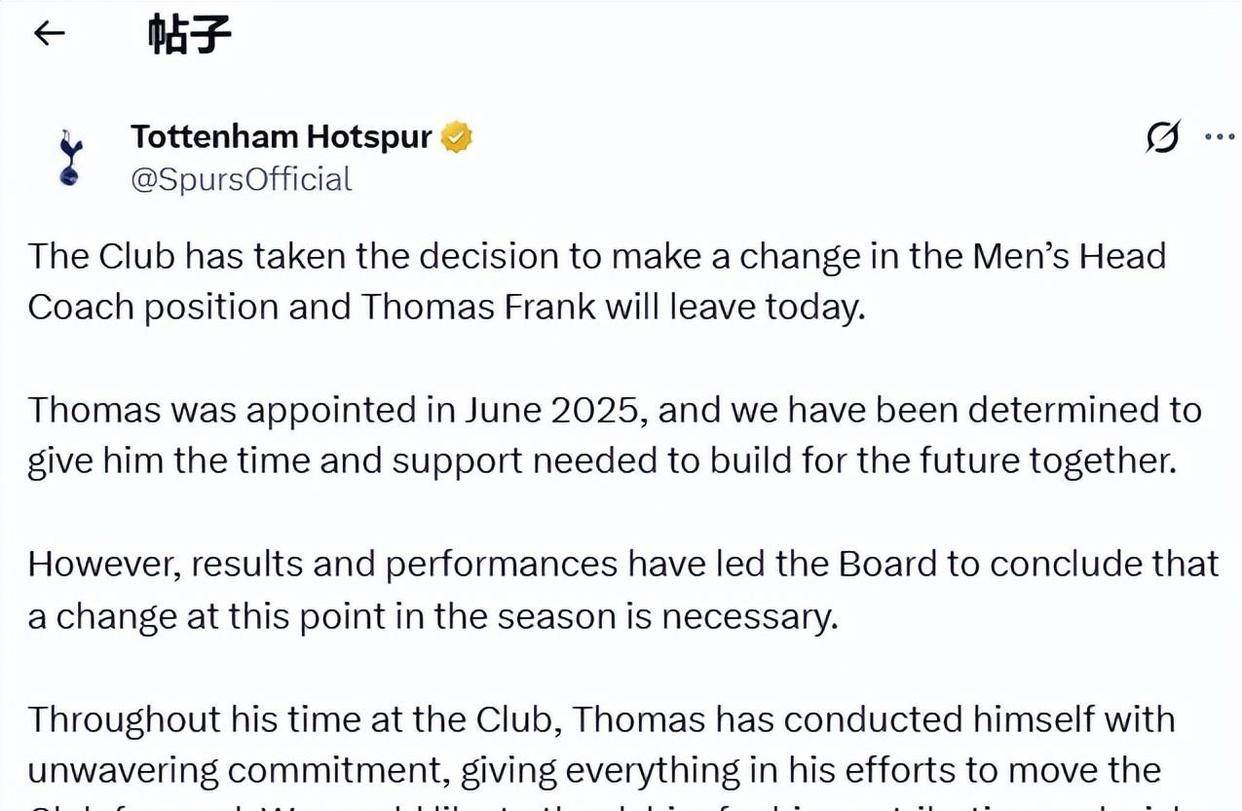 英超直播,英超赛程,英超积分榜,英超比分预测,曼联利物浦直播/覆盖2025年英超联赛所有比赛,提供免费高清中文直播入口、最新赛程安排、实时积分榜、比分预测与波胆分析,聚焦曼联、利物浦、曼城、阿森纳等豪门动态。英超又一位主帅倒下了! 托马斯·弗兰克被热刺官方宣布解雇,这消息像一颗炸弹在足球圈炸开。 8场联赛0胜,联赛排名跌至第16位,老板刘易斯家族终于忍无可忍。 52岁的丹麦教头成了本赛季英超下课的第7人,执教热刺不到一年就黯然离场。 足球世界的残酷再次赤裸裸地展现在所有人面前,成绩是唯一的硬道理,哪怕你在欧冠赛场风光无限。