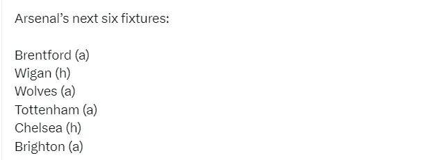 阿森纳未来6场比赛:客战布伦特福德、主战维冈、客战狼队、客战热刺、主战切尔西、客战布莱顿。