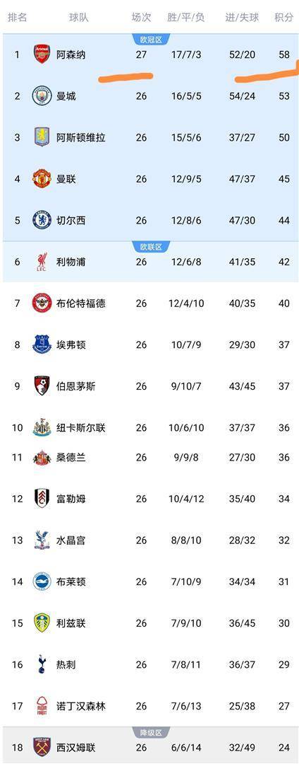 这场平局对英超积分榜产生了立竿见影的影响。 此役之前,阿森纳在26轮过后领先第二名曼城4分。 这场2-2之后,多赛一场的阿森纳积分达到57分,但他们对曼城的领先优势仅仅扩大了1分,变为5分。 这意味着,如果曼城在随后的比赛中取胜,双方的分差极有可能被缩小到2分。 更重要的是,在联赛剩余的赛程中,曼城还将在主场迎来与阿森纳的直接对话。 这场平局让曼城重新掌握了争冠的主动权,因为只要蓝月亮赢下剩余的所有比赛,他们就能确保夺冠,无需再看阿森纳的脸色。