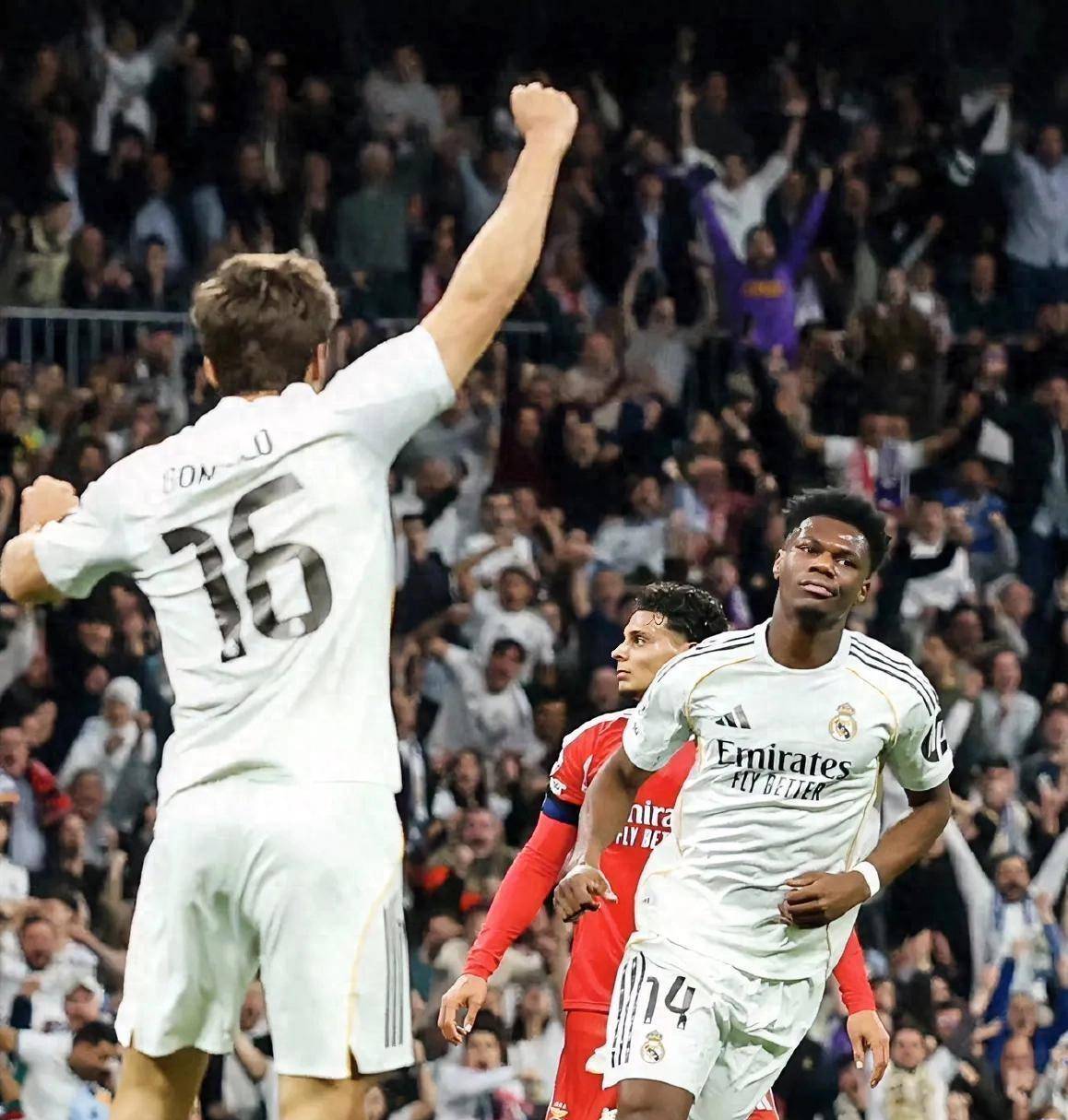 皇马那边就稳多了。 首回合1-0领先,次回合回到伯纳乌。 第14分钟拉法·席尔瓦补射破门,本菲卡1-0皇马,总比分1-1扳平。
